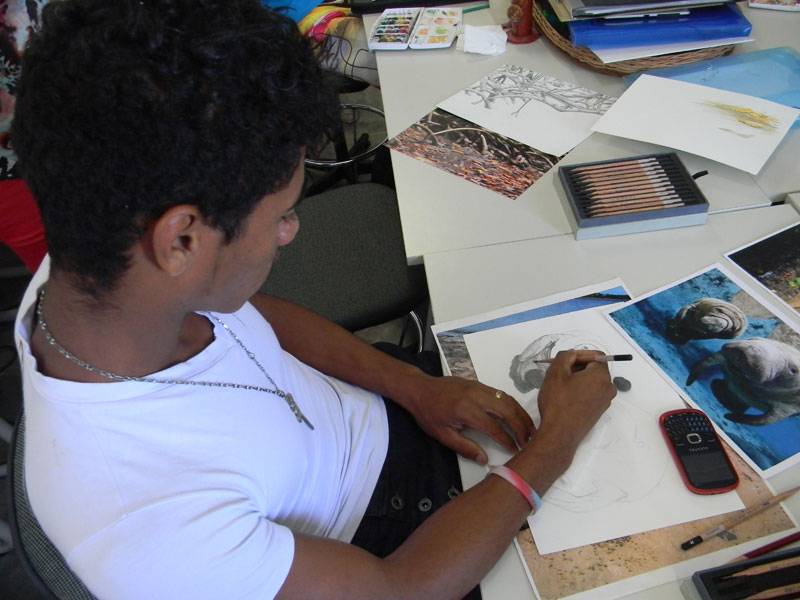 "Mudou tudo". É assim que, entre o cuidado com o desenho e um desvio para a conversa, Ubiratan Teixeira, 17 anos, reforça que participar do projeto foi ponto crucial em sua vida. Morador do povoado Pedra Furada, também em Santa Luzia do Itanhy, ele exibe um sorriso largo ao contar sua história. É pai de um menino que acabou de completar um mês, estuda o sétimo ano do ensino fundamental e tem grandes planos para o futuro como pintor ou desenhista. Começou a desenhar cedo e teve no pai a referência para seguir na profissão. "Meu pai desenhava bonecos. Via ele fazendo isso e acabava fazendo também", conta.