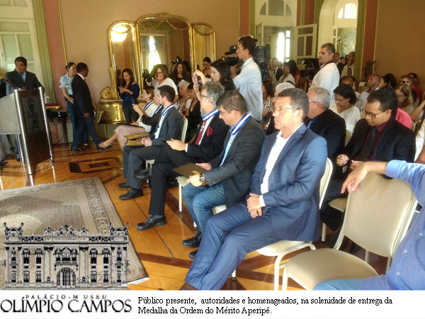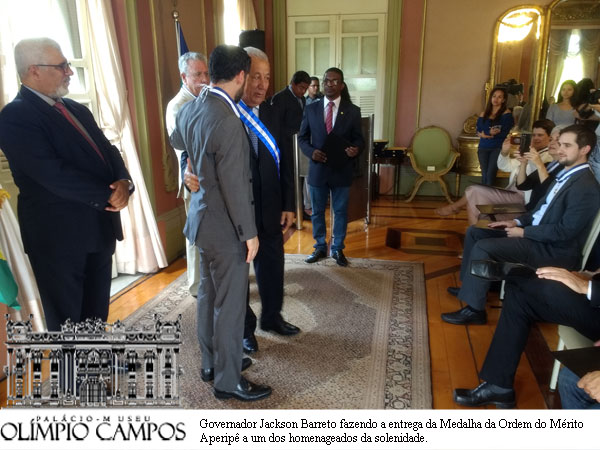 No dia 21 de fevereiro de 2018, o governador do Estado o Sr. Jackson Barreto, utilizou as dependências do Palácio Museu Olímpio Campos (salão nobre), para fazer a entrega da ?Medalha da Ordem do Mérito Aperipê? maior condecoração do Estado de Sergipe, no grau de grande Oficial a sete (07) Instituições da sociedade Civil que vem contribuindo com o desenvolvimento da Educação no nosso Estado. Foram as seguintes Instituições homenageadas: - Instituto Natura ? Fundação Telefônica Vivo ? Instituto de Pesquisas em Tecnologia e Inovação (IPTI) ? Fundação Lemann ? Instituto Sonho Grande ? Itaú BBA e o Instituto de Corresponsabilidade pela Educação (ICE). A solenidade foi bastante concorrida e usou da palavra o Secretário de Estado de Governo o Sr. Benedito Figueiredo, abrindo os trabalhos como ?Chanceler da Ordem?, seguindo a palavra do Secretário de Estado de Educação o Professor Jorge Carvalho que enalteceu a contribuição dos homenageados a educação no Estado, finalizando o evento a palavra do Governador que agradeceu o apoio dessas instituições ao desenvolvimento da Educação no nosso Estado, mostrando a importância da relação entre poder público e sociedade civil, no desenvolvimento do Estado.
